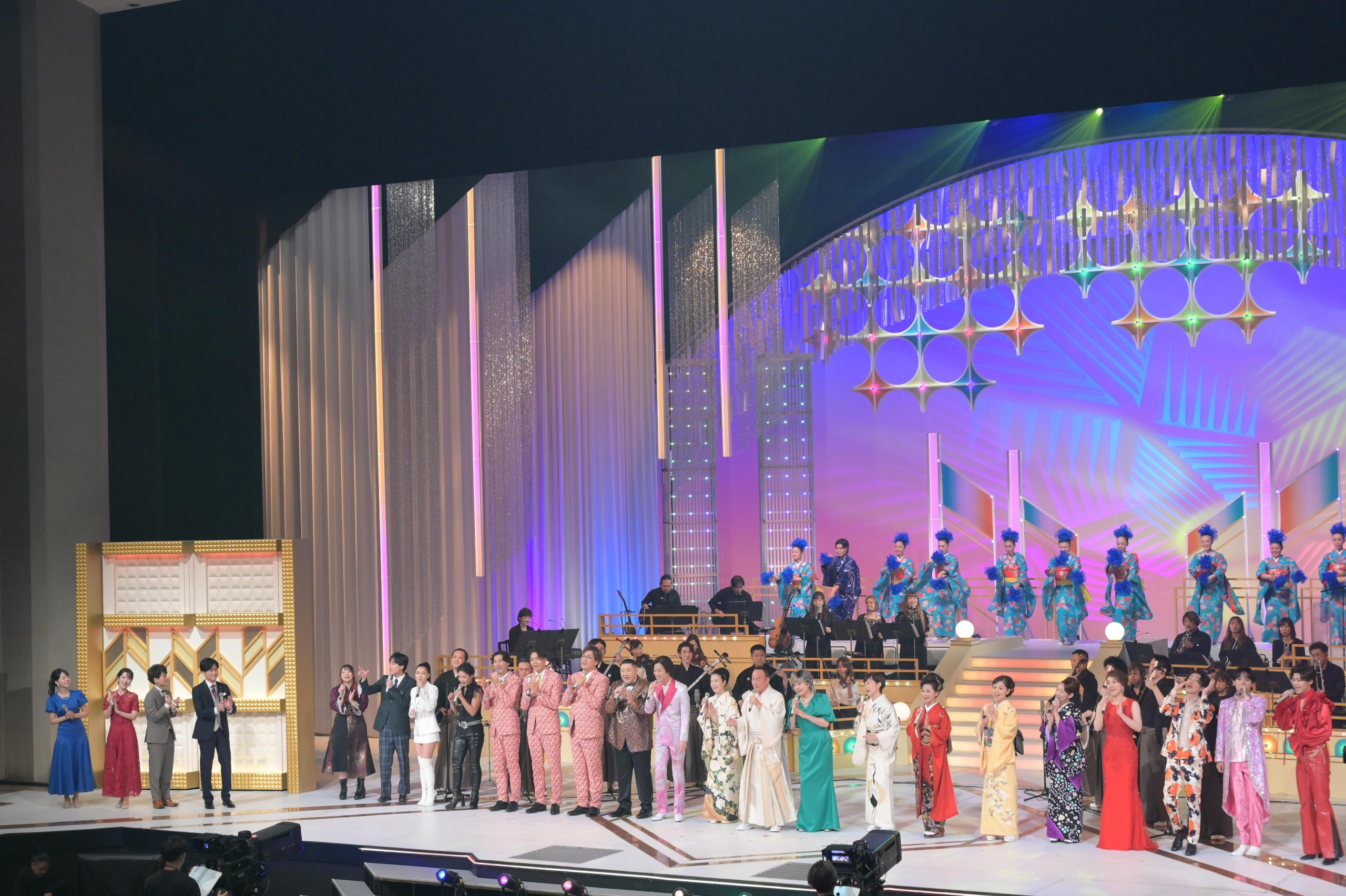 「演歌フェス2025」は2部構成。第1部の幕開けは、出演者全員による冠二郎の代表曲「炎」の大合唱から始まる。ステージ上が豪華絢爛な衣裳で埋め尽くされ、NHKホールは一瞬にして祝祭の空間へと変貌する。